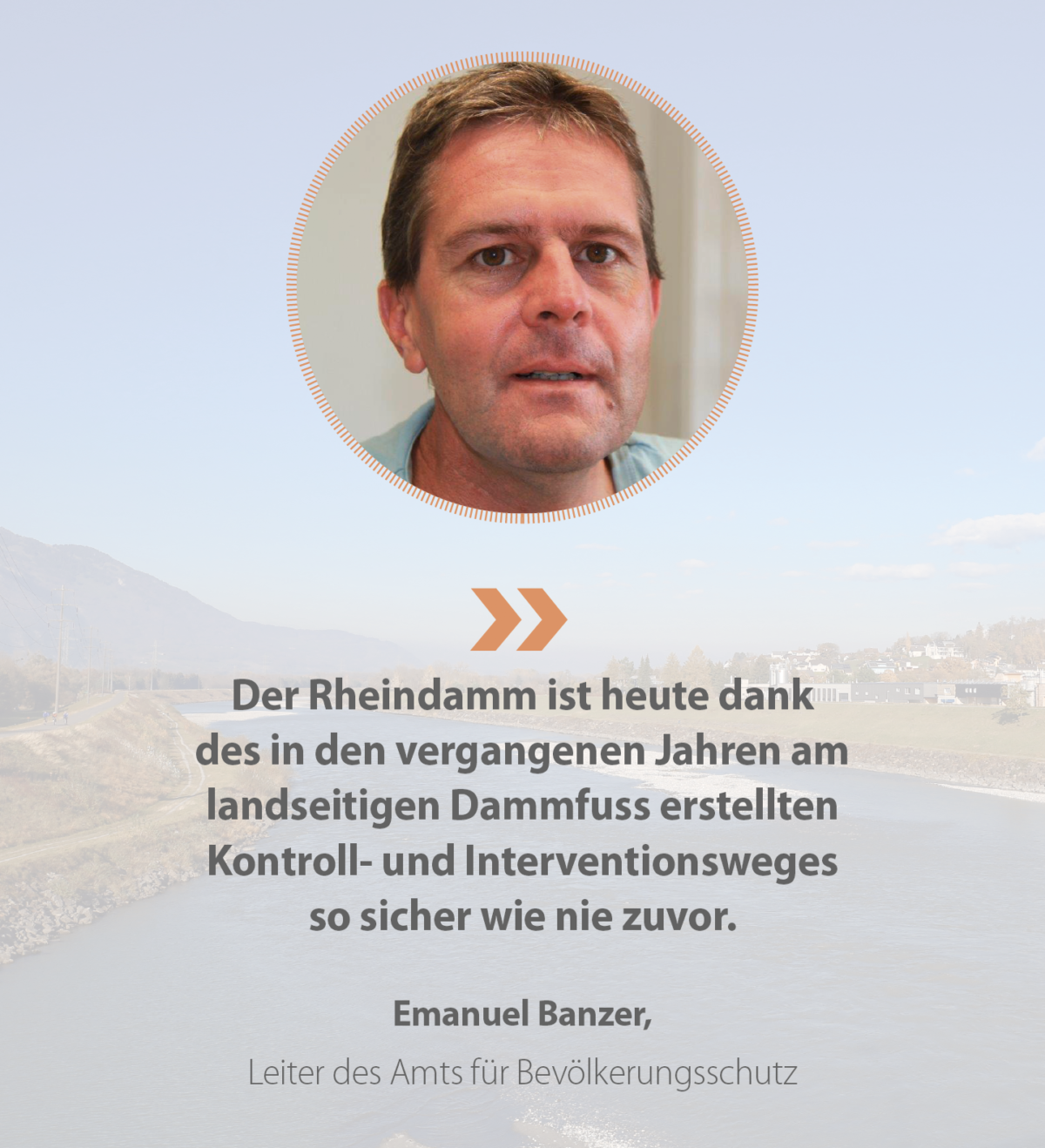 «Ein Dammbruch, der bei einem grossen und sehr selten auftretenden Hochwasser aufgrund vorhandener Instabilitäten nicht ausgeschlossen werden kann, hätte für Liechtenstein existenzbedrohende Auswirkungen. Vor diesem Hintergrund misst die Regierung dem Sanierungsprojekt eine elementare Bedeutung bei», sagt Emanuel Banzer, der Leiter des Amts für Bevölkerungsschutz (ABS). «Oberste Priorität bei der Sanierung der Rheindämme hat die Gewährleistung eines hohen Sicherheitsniveaus für die Bevölkerung.»