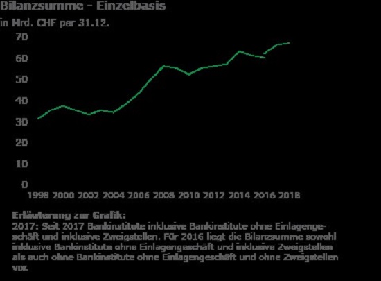 Die Bankinstitute inklusive Tochtergesellschaften (konsolidiert) verwalteten Ende 2018 CHF 305.1 Mrd. an Kundenvermögen. Es konnte ein Nettoneugeldzufluss von CHF 33.4. Mrd. ausgewiesen werden.