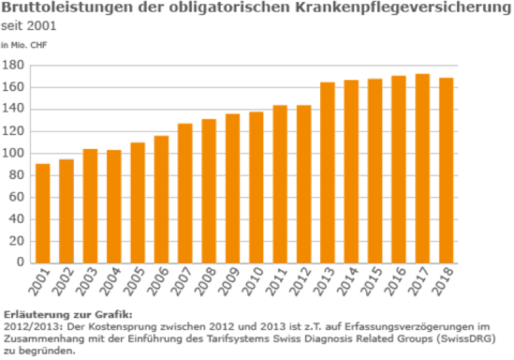 Mit Bruttoleistungen in der Obligatorischen Krankenpflegeversicherung (OKP) von CHF 168.2 Mio. im Jahr 2018 wurden 2.1% weniger Leistungen abgerechnet als 2017. Die Grafik zeigt für die letzten Jahre einen weniger starken Anstieg der Bruttoleistungen als früher. Diese Eingrenzung der Kosten ist zu einem Teil der Angleichung der liechtensteinischen Tarifstruktur an die schweizerischen Tarife zuzuschreiben. So wurden seit 2014 die Taxpunktwerte der Physiotherapie (von CHF 1.26 auf CHF 1.05), des Fachlabors (von CHF 1.20 auf CHF 1.00) und des Praxislabors (von CHF 1.50 auf CHF 1.00) gesenkt.