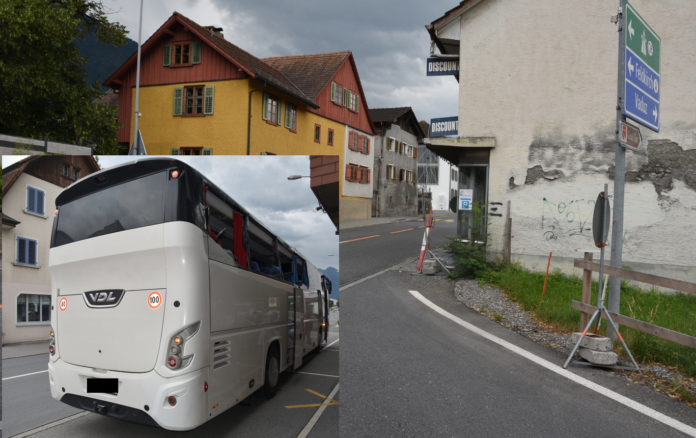Gegen 10:15 Uhr fuhr in Schaan ein Reisebus auf der Poststrasse in südliche Richtung und beabsichtigte dem Strassenverlauf folgend auf die Landstrasse einzubiegen. Bei der hierzu notwendigen Rechtskurvenfahrt kollidierte der mit einer Reisegruppe von 35 Personen besetzte Bus mit einem Betonvorbau eines Anwesens am Einmündungsbereich. Durch die Kollision zersplitterten mehrere Fenster des Reisebusses und einige Fahrgäste wurden dadurch leicht verletzt.