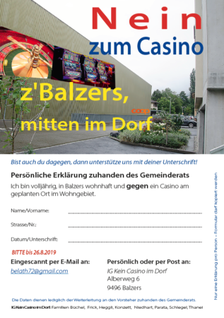 Ziel der IG Kein Casino im Dorf, die hinter dieser Aktion steht, ist es, das Casino vom vorgesehenen Standort im Wohngebiet zu verbannen. Obwohl sich die Baukommission gegen eine Ausnahmebewilligung aussprach, hat kurz danach der Balzner Gemeinderat in grösster «Vertraulichkeit» die Zonenkonformität dennoch bewilligt, allerdings ohne den betroffenen Anwohnern rechtliches Gehör zu gewähren. Der eherne Grundsatz «Höre beide Teile» wurde perfide verletzt und das darf nicht sein.