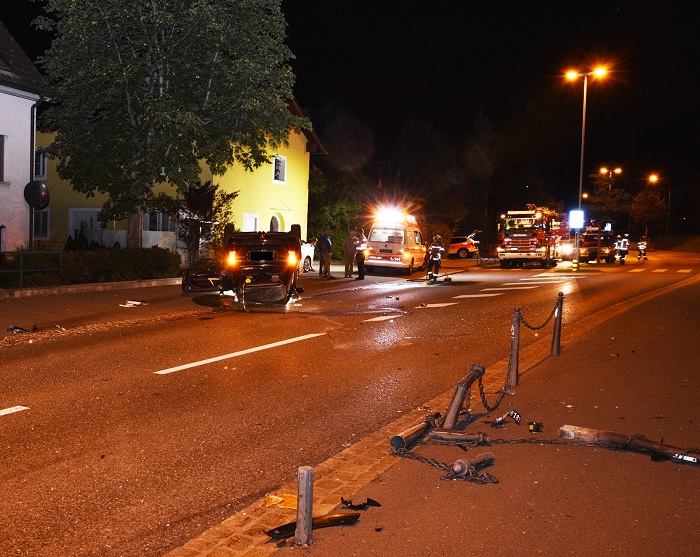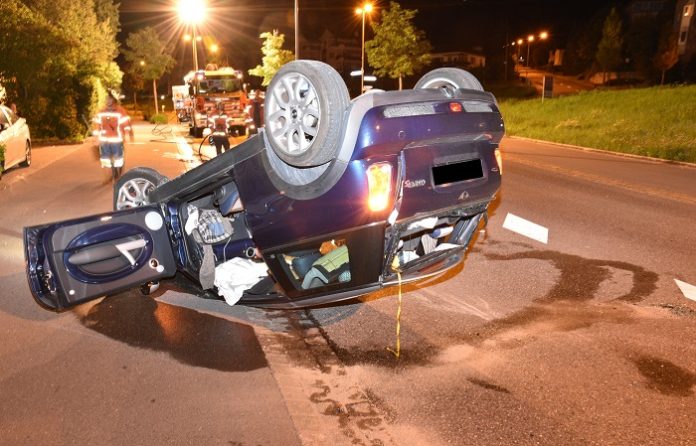 Am Montag gegen 00:30 Uhr fuhr in Schaan ein alkoholisierter Mann mit seinem Auto auf der Feldkircherstrasse in nördliche Richtung und kam dabei mit seinem Fahrzeug über den rechten Fahrbahnrad hinaus. In der Folge kollidierte er mit Eisenpfosten, worauf sich das Auto überschlug und auf dem Fahrzeugdach landete. Verletzt wurde niemand. Am Fahrzeug entstand Totalschaden. Beim Fahrzeuglenker wurde eine Blutentnahme angeordnet und dessen Führerausweis eingezogen