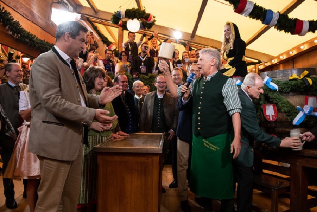 Pünktlich um 12 Uhr mittags zapfte Oberbürgermeister Dieter Reiter das erste Fass des Münchner Oktoberfestes 2019 an. Er benötigte zum Anzapfen zwei Schläge.