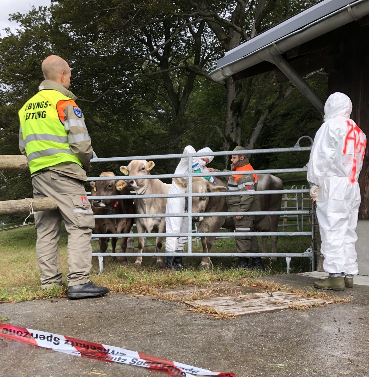 Für die Angehörigen der Tierseuchengruppe unter dem Kommando von Kommandant Andreas Klauser sind solche Übungen immer wieder eine Herausforderung. Die Tierseuchengruppe unterstützt die amtlichen Tierärzte bei der möglichst raschen Ausrottung von hochansteckenden Seuchen. Damit sollen gesundheitliche und wirtschaftliche Schäden verhindert oder möglichst gering gehalten werden.