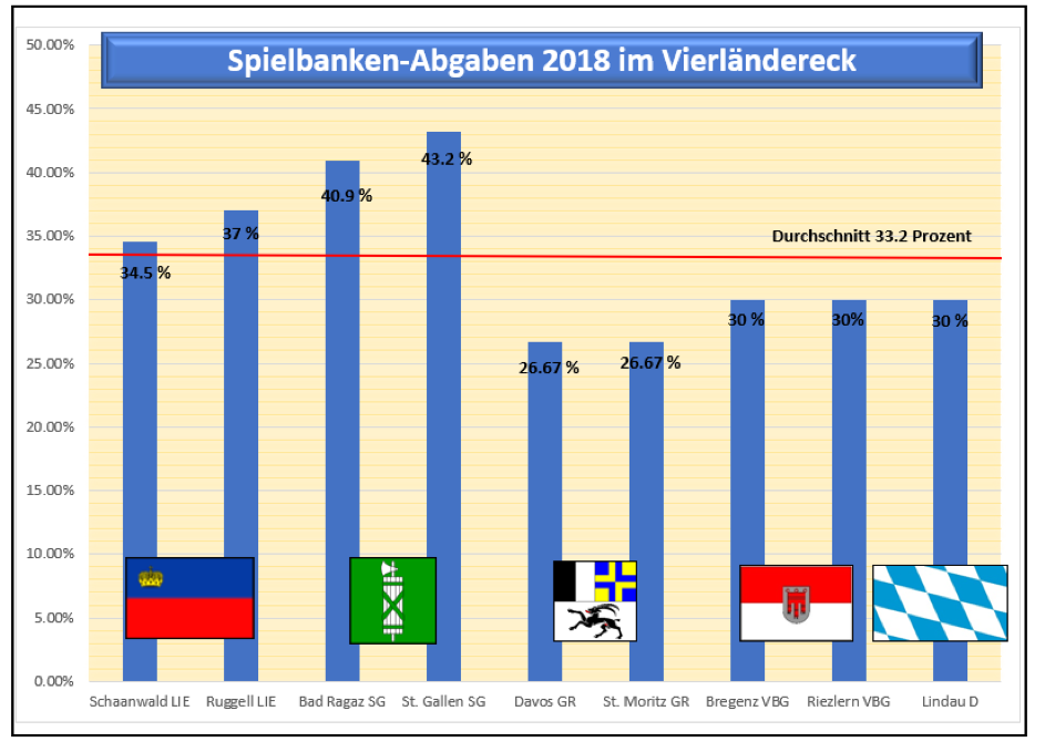 Die FL will nun den vor kurzem von ihr als zu hoch erachteten Abgabesatz jetzt kurzerhand erhöhen. Argumentiert wird, dass die Sätze in der Schweiz viel höher seien. Ein Mythos, wie die wirtschaftliche Realität zeigt. Die liechtensteinischen Spielbankenabgaben 2018 liegen mit 35,7 Prozent im Vierländereck-Marktvergleich bereits über dem Durchschnitt! Im Marktumfeld tiefer als in Liechtenstein sind die Abgabesätze in Graubünden (26,7 Prozent), Vorarlberg (30 Prozent) sowie Bayern mit Lindau (30 Prozent, ab 2019 sogar 25 Prozent). Einzig im Kanton St. Gallen werden mit 42 Prozent mehr Abgaben abgeführt.