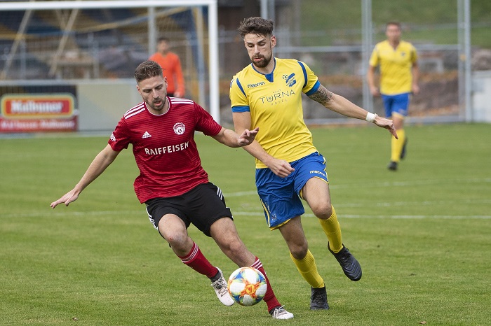 Der FC Triesenberg (Bild rechts Hanselmann) empfängt heute Mittwochabend im Viertelfinale des FL Cup den Zweitligisten FC Ruggell.
