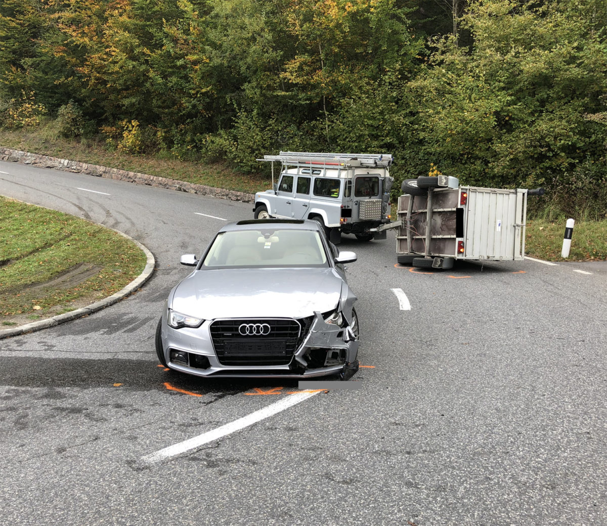 Gegen 09:40 Uhr fuhr ein Autolenker auf der Bergstrasse talwärts, als ihm eine Fahrzeugkombination, bestehend aus einem Personenwagen und Sachentransportanhänger, in einer Kurve entgegen kam. Bedingt durch die Kurvenfahrt beider Fahrzeug kam es innerhalb des Kurvenbereichs zu einer Kollision. An beiden Fahrzeugen entstand Sachschaden.