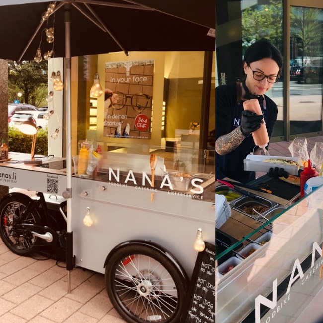 Nanas Foodbike, hier gibt es Hot Dogs mit einer würzigen Liechtensteiner Wurst oder Vegi inkl. 10 Toppings wie Sauerkraut, Röstzwiebeln, Rucola und vieles mehr. Catering ab 4 bis 80 Personen.