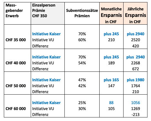 Beim Vergleich der beiden Initiativen «Kaiser» und «VU» auf der Basis der Ersparnis für den einzelnen Versicherten zeigt sich sehr deutlich, dass bei der Initiative von Johannes Kaiser vor allem die tiefen Erwerbe gegenüber der Initiative der VU stärker profitieren.