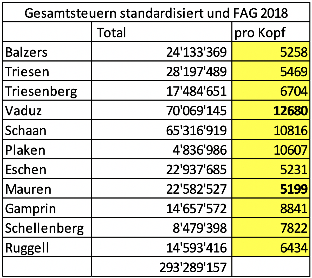 Die tiefsten pro Kopf Einnahmen weist die Gemeinde Mauren mit CHF 5’199.- auf, die höchsten pro Kopf Einnahmen die Gemeinde Vaduz mit CHF 12’680.-. Beitragsleistungen unter anderem im Sozialbereich, die einen erheblichen Teil des Finanzausgleichs verzehren, werden ebenfalls jeder Gemeinde pro Kopf in Rechnung gestellt. Es liegt auf der Hand, dass denjenigen Gemeinden mit den tieferen pro Kopf Einnahmen dann weniger Geld für Investitionen zur Verfügung steht, sobald diese Gemeinden ihre Beitragsleistungen beglichen haben. Über die Jahre betrachtet wird sich diese Schere immer weiter öffnen. Die mittelgrossen Gemeinden sind so gezwungen, ihre Reserven überproportional gegenüber den anderen Gemeinden abzubauen.