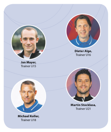 Der 30-jährige Deutsche aus Stockach am Bodensee besitzt die DFB-A-Lizenz und hat kürzlich ein Studium in Sportwissenschaften beendet. Für den LFV ist er seit Anfang des Jahres neben der U15 auch als Co-Trainer bei der U21-Nationalmannschaft sowie als Sportschultrainer und Ausbildner im Projekt «Fussball macht Schule» vollzeitlich tätig. Zuvor trainierte er während bereits acht Jahren diverse Jugendteams, unter anderem beim VFB Stuttgart und den Stuttgarter Kickers. Assistiert wird Mayer vom Vorarlberger Muhammed Gerdi, dessen Trainerdiplom die UEFA-A-Lizenz ist. Mit Dieter Alge leitet ein weiterer Vorarlberger die Geschicke der U16. Mit seinen sage und schreibe 20 Jahren im Trainergeschäft, unter anderem als Spielertrainer beim FC Balzers (1999 – 2003) und zuletzt als Assistenztrainer beim österreichischen Bundesligisten SV Ried, bringt der 53 Jahre alte Alge neben der UEFA-A-Lizenz auch reichlich Erfahrung mit. Er ist ausserdem noch Haupttrainer der U17-Nationalmannschaft. Auch sein Co-Trainer, Branko Dunjic, hat eine Vergangenheit beim FC Balzers, als Assistenztrainer von 2011 bis 2016. Der Sarganserländer ist 59 Jahre alt und besitzt das UEFA-B-Diplom. Haupttrainer der U18, der vorletzten Ausbildungsstation des LFV vor dem Wechsel zum Team FC Vaduz 2 bzw. in den Männerfussball, ist Michael Koller. Seit einem Jahrzehnt ist der 50-jährige Aargauer nunmehr in diversen Ämtern beim LFV vollzeitlich angestellt.