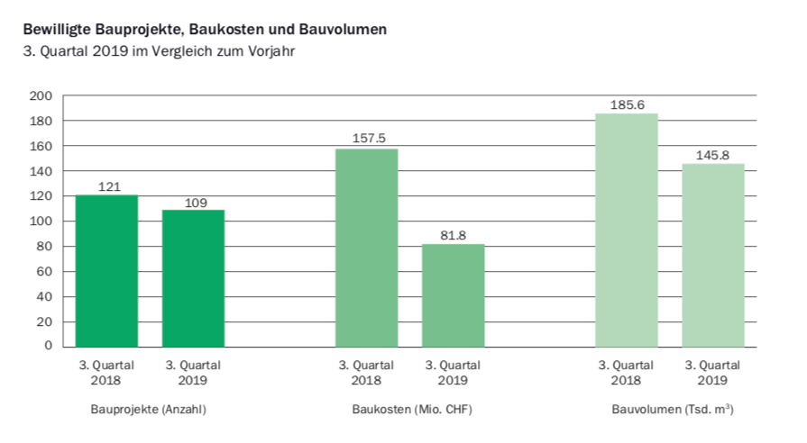 Gemäss den Ergebnissen des Amtes für Statistik wurden im 3. Quartal 2019 vom Amt für Bau und Infrastruktur 109 Baubewilligungen erteilt. Im gleichen Quartal des Vorjahres waren es 121 Baubewilligungen gewesen. Die Anzahl bewilligter Neubauprojekte stieg gegenüber dem Vorjahresquartal um eines auf 34. Die Anzahl der Veränderungsbauprojekte nahm gegenüber dem Vorjahresquartal um 13 auf 75 ab.