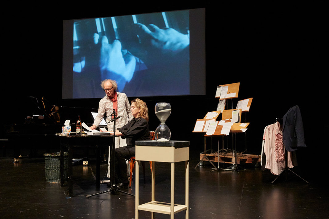«monologisieren» gleichzeitig in tausendfacher Kommunikation mit den sich collage- artig auftürmenden musikalischen Klang- und Zeitschichten. Als wäre dies alles nicht schon Grund genug, ein Pianistenpaar an den Rand der Verzweiflung zu treiben, sollen die «Monologe» in einer genau 52-minütigen multimedialen Portrait-Collage präsentiert werden. Höchste Zeit, einen Paartherapeuten (Jürg Kienberger) zu kon- sultieren! Mit seiner Hilfe taucht das Duo in die Vergangenheit ein. Zu dritt analysie- ren sie, legen Schichten frei, dringen bis zum Pfingsthymnus vor. Einiges läuft dabei aus dem Ruder. Aus dem immer dichter werdenden Geflecht aus Zitaten, Musik-, Bild-, Ton- und Gesprächsfragmenten tauchen schliesslich die originalen «Monolo- ge» auf – unversehrt. Klingen sie jetzt anders?