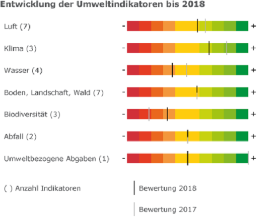 Aufgrund der Ergebnisse für die Indikatoren, welche die längerfristige Entwicklung bis 2018 aufzeigen, verläuft die Entwicklung im Themenbereich Klima leicht positiv. Die Bereiche Wasser und Biodiversität zeigen eine negative Entwicklung. In den Bereichen Luft, Abfall, umweltbezogene Abgaben sowie Boden, Landschaft und Wald zeigt sich keine wesentliche Veränderung.