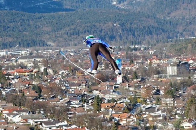 Sprung von der Schanze in Garmisch. So schaut die gegenwärtige Schneelage aus. Die Schanzenanlagen wurden mit Kunstschnee präpariert.