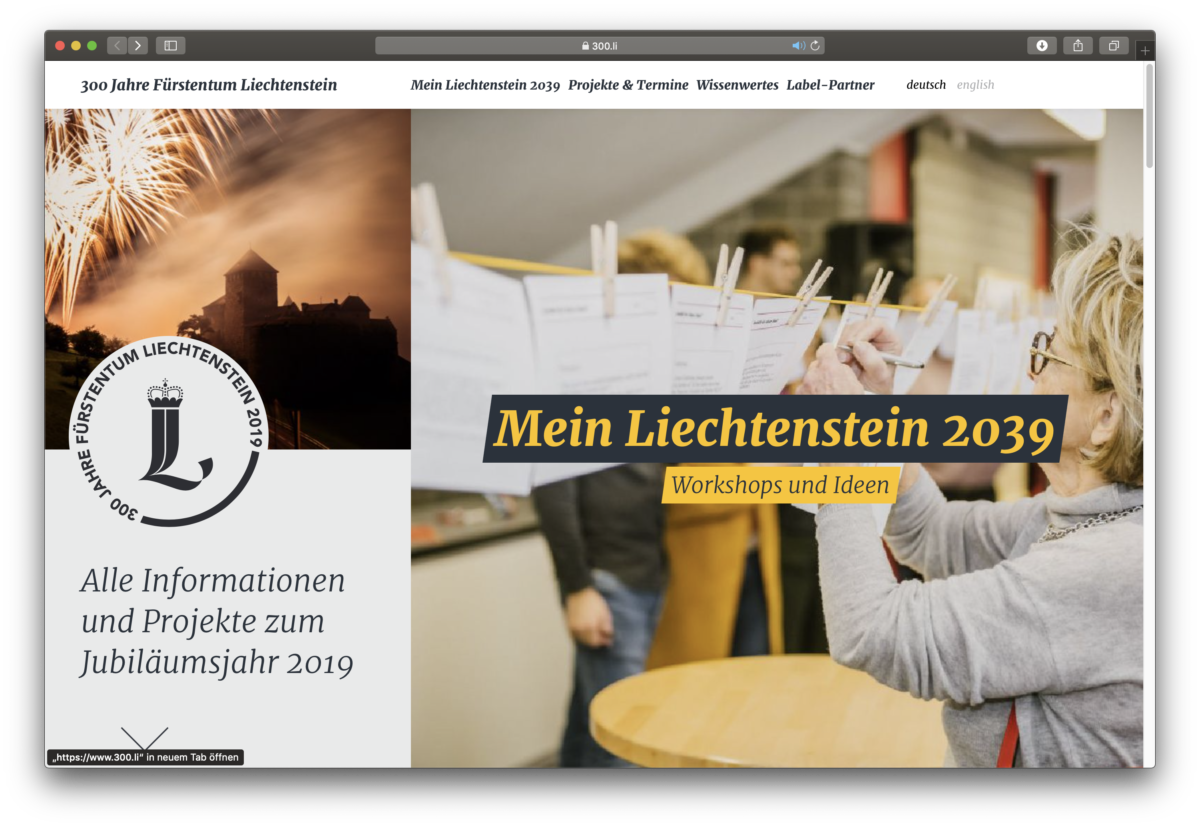 Das Zukunftsprojekt «Mein Liechtenstein 2039» bot der Bevölkerung am Ende 2019 die Möglichkeit, sich über das Jubiläumsjahr hinaus für die Zukunft Liechtensteins einzubringen. «Es war beeindruckend zu sehen, wie viele Leute aus Liechtenstein diese Chance genutzt haben, um sich aktiv einzubringen. Zusammen haben die Patinnen und Paten, das Leitungsteam und die Mitwirkenden an den Workshops gut 3000 freiwillige Arbeitsstunden in Liechtensteins Zukunft investiert» so Fabian Reuteler, Gesamtprojektleiter 300 Jahre Fürstentum Liechtenstein.