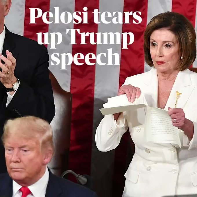 Nachdem Donald Trump seine insgesamt 3. Rede zur Lage der Nation gehalten hat, in welcher er sich mit Eigenlob nur so überschüttete, kommt es zum Eklat. Die Oppositionsführerin Nancy Pelosi zerreisst das Redemanuskript von Donald Trump.