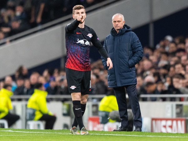 19.02.2020, Großbritannien, London: Fußball: Champions League, Tottenham Hotspur - RB Leipzig, K.o.-Runde, Achtelfinale, Hinspiele, im Tottenham Hotspur Stadium. Tottenhams Trainer Jose Mourinho (r) beobachtet Leipzigs Timo Werner. Foto: Robert Michael/dpa-Zentralbild/dpa | und Picture Alliance, Frankfurt/Main.