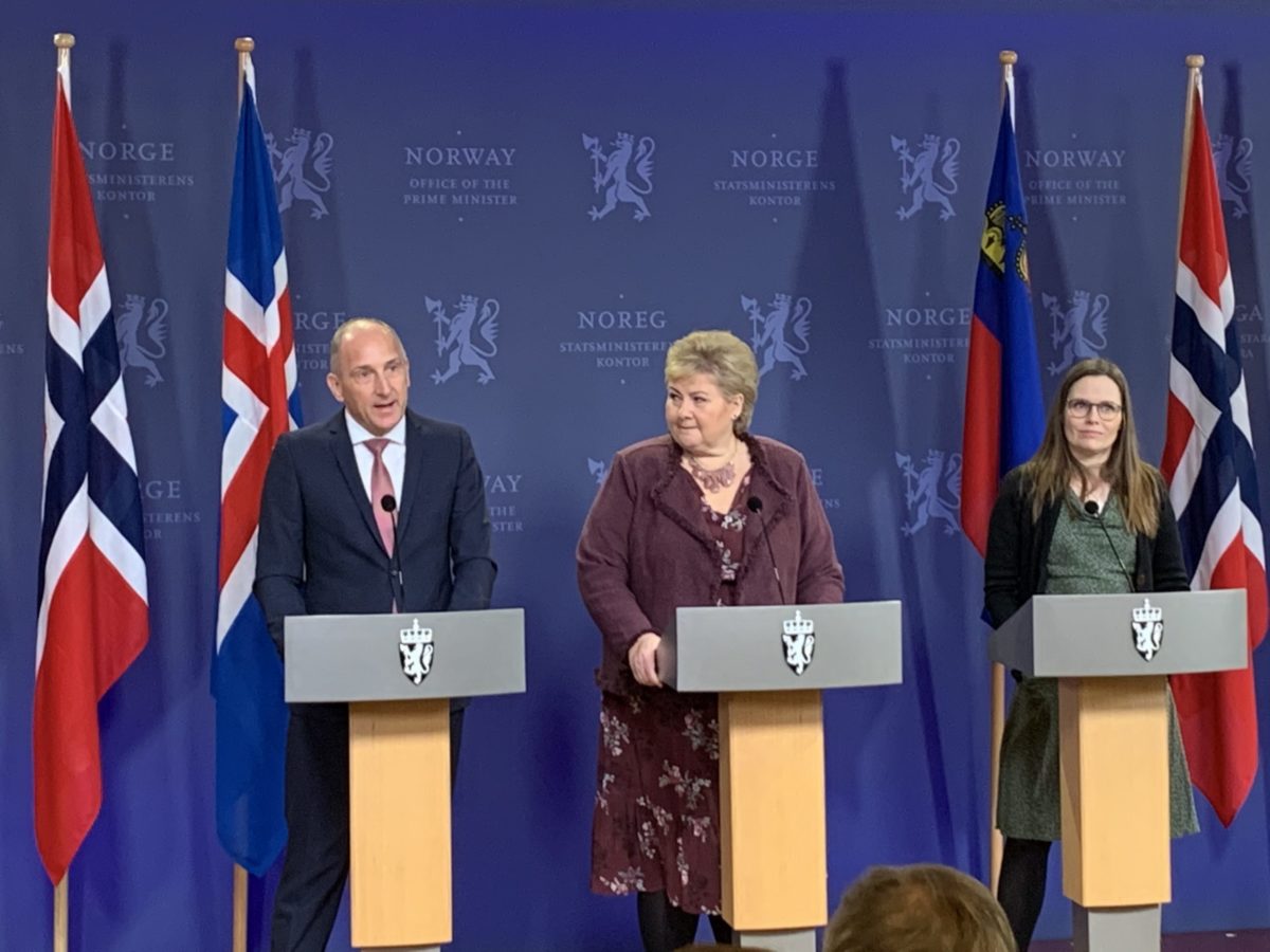Am 3. Februar trafen sich Regierungschef Adrian Hasler, Norwegens Regierungschefin Erna Solberg und Islands Regierungschefin Katrin Jakobsdottir zu einem Arbeitstreffen in Oslo. Die Schwerpunkte der gemeinsamen Gespräche waren generelle Themen zum EWR-Abkommen, die gemeinsamen Interessen im Hinblick auf die Prioritäten der neuen EU-Kommission sowie die künftigen Beziehungen zu Grossbritannien nach dem Brexit.
