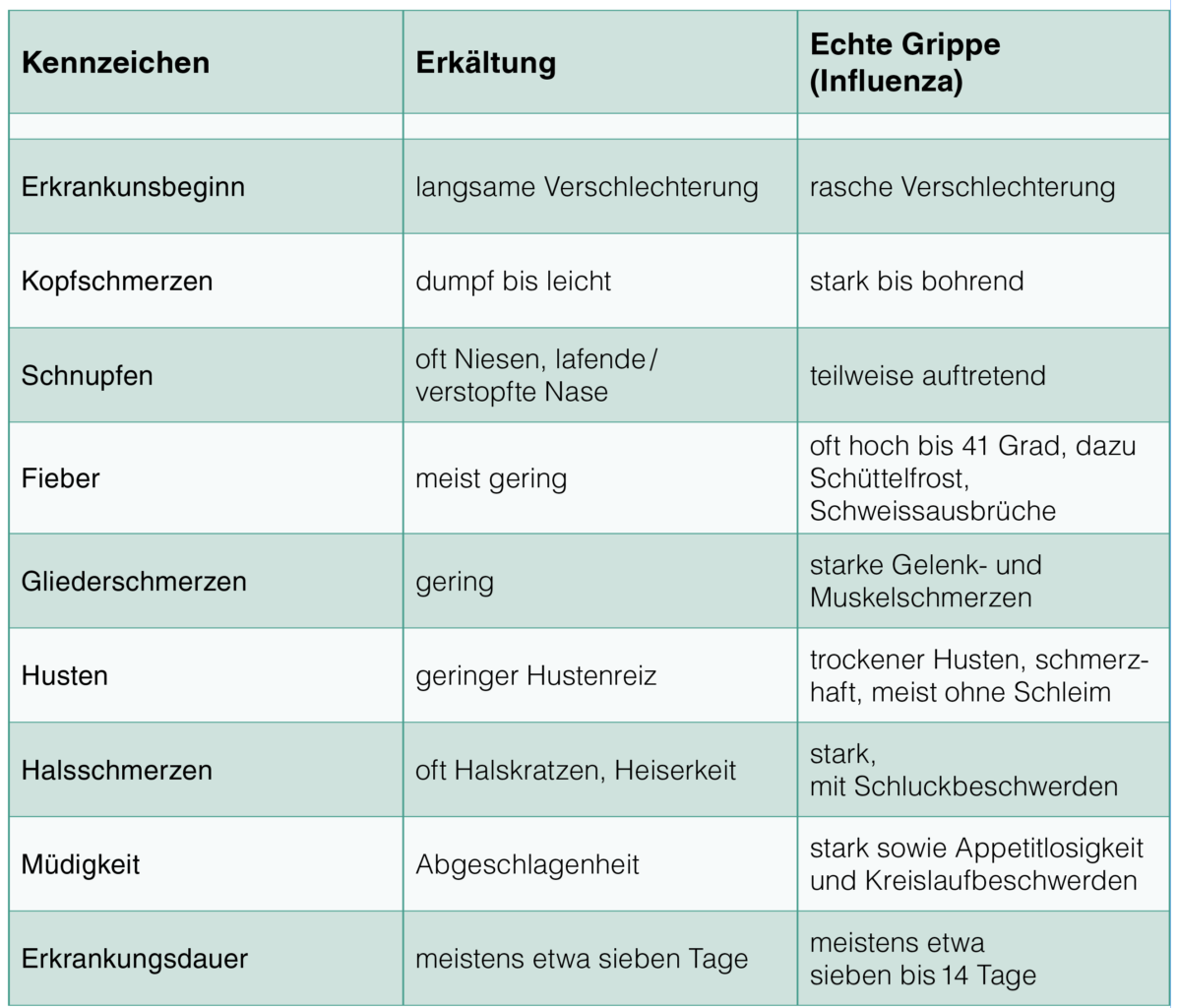 Eine Erkältung (grippaler Infekt) ist eine Infektion der oberen Atemwege und wird oft mit Grippe (Influenza) verwechselt. Beide Erkrankungen haben ähnliche Symptome: Fieber, Schnupfen, Husten, Halsschmerzen und Krankheitsgefühl. Letzteres ist bei Grippe jedoch stärker ausgeprägt als bei einem grippalen Infekt. Gegen eine Erkältung helfen Schonung und die Einnahme von bewährten Hausmitteln. Zur Prävention hilft eigentlich alles, was das Immunsystem stärkt, allem voran eine gesunde Lebensführung und angepasste sportliche Betätigung.