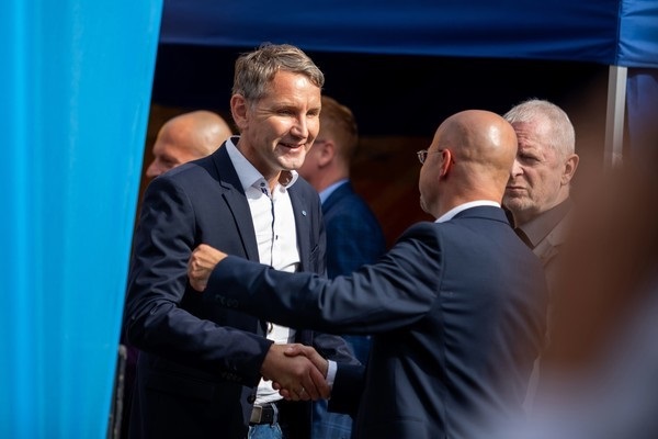 DEU/Deutschland/Brandenburg/Cottbus, 13.07.2019, Bjoern Hoecke und Andreas Kalbitz, Wahlkampfauftakt der AFD (Alternative fuer Deutschland) zur Landtagswahl 2019, Bjoern Hoecke begruesst und umarmt seinen Parteifreund Andreas Kalbitz (Spitzenkandidat AFD Brandenburg) auf der AFD-Wahlkampfveranstaltung in Cottbus. |Foto: Picture Alliance, Frankfurt/Main.