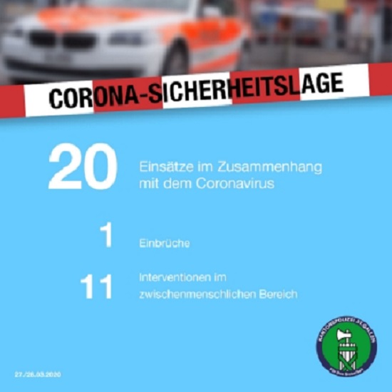In der Zeit zwischen Freitag- und Samstagmorgen (28.03.2020) ist die Kantonspolizei St.Gallen mit insgesamt 20 Fällen mit Bezug zum Coronavirus beschäftigt gewesen.