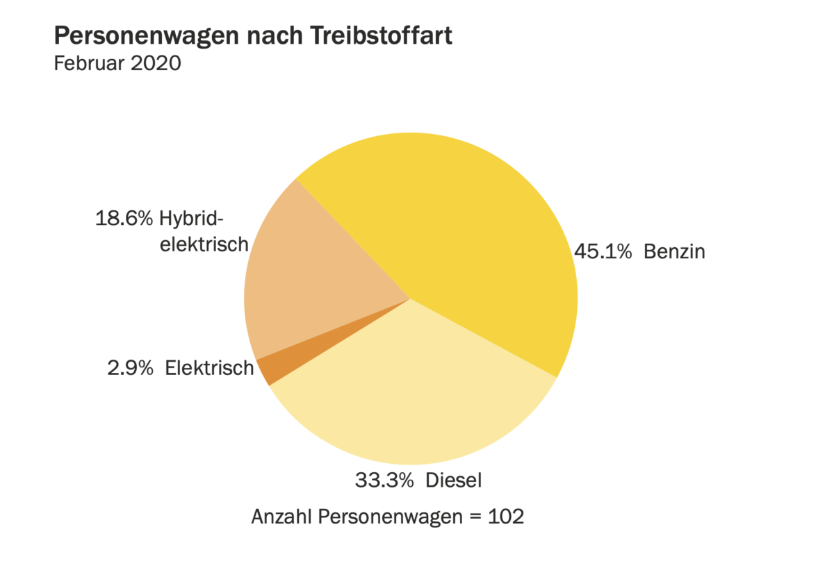 46 Personenwagen (45.1%) waren Benziner. 34 Personenwagen (33.3%) waren Dieselfahrzeuge, 19 waren hybridelektrisch und drei rein elektrisch angetriebene Personenwagen mit Anteilen von 18.6% bzw. 2.9% aller im Berichtsmonat erstzugelassenen Personenwagen.