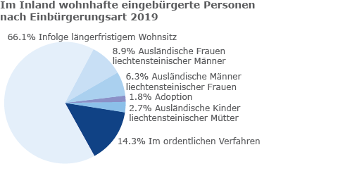 Im Jahr 2019 wurden 112 in Liechtenstein wohnhafte Ausländerinnen und Ausländer eingebürgert. 66.1% der Eingebürgerten erhielten infolge längerfristigem Wohnsitz die liechtensteinische Staatsbürgerschaft. Zudem wurden 27 im Ausland wohnhafte Personen eingebürgert.