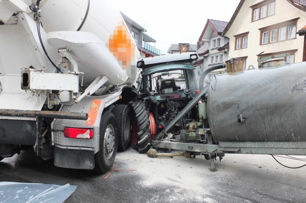 Ein 50-jähriger Bauarbeiter fuhr mit seinem Betonmischer auf der Oberrieterstrasse in Richtung Altstätten. Er bog wenige Meter links in die Harztannenstrasse ab, mit dem Ziel, anschliessend rückwärtsfahrend eine Baustelle an der Oberrieterstrasse zu beliefern. Gleichzeitig fuhr ein 68-jähriger Landwirt mit Traktor und Druckfass von Altstätten in Richtung Oberriet. Es kam zur Kollision der beiden Fahrzeuge. Durch den Zusammenprall wurde der Dieseltank des Betonmischers beschädigt, wodurch ungefähr 50 Liter Diesel auf die Fahrbahn, in einen Meteorschacht und in den Höflibach flossen. Die aufgebotene Feuerwehr sperrte den Bach, sog das verunreinigte Wasser ab und spülte die Meteorleitung mit sauberem Wasser. Dank der schnellen Reaktion der Feuerwehr, konnte ein Umweltschaden verhindert werden. Bis die Fahrzeuge geboren und die Strasse vom Strassenunterhaltsdienst gereinigt war, musste diese für rund zwei Stunden gesperrt werden. Der 68-jährige Traktorfahrer wurde durch den Zusammenstoss leicht verletzt, konnte jedoch selbständig einen Arzt aufsuchen. Der entstandene Sachschaden beläuft sich auf mehrere zehntausend Franken.