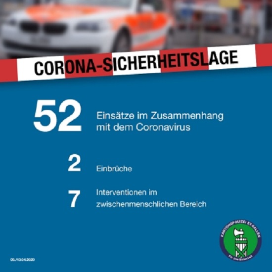 In der Zeit zwischen Donnerstag- und Freitagmorgen (10.04.2020) ist die Kantonspolizei St.Gallen rund 52 Mal im Zusammenhang mit de Coronavirus ausgerückt. Sie musste zudem sieben Mal im zwischenmenschlichen Bereich intervenieren. In dieser Zeit ereigneten sich lediglich zwei Einbrüche.