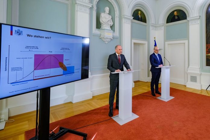 Regierungschef Adrian Hasler, links, und Vizeregierungschef Daniel Risch, rechts, bei ihren Ausfuehrungen, aufgenommen am Donnerstag, 9. April 2020, bei der Medienkonferenz im Regierungsgebaeude zur derzeitigen Corona Pandemie in Liechtenstein. Foto & Copyright: IKR/Eddy Risch.