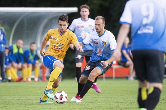 In der Herbstrunde (14.8.2019) verloren die USV'ler im Lokalderby in Balzers mit 5:0. Im Bild Hermann (l.) im Zweikampf mit Gubser. Bildmitte USV'ler Wolfinger.