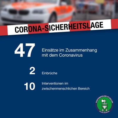 Die Kantonspolizei St.Gallen hat vom Montagmorgen bis Dienstagmorgen (07.04.2020) 47 Einsätze im Zusammenhang mit dem Coronavirus zu verzeichnen. Im zwischenmenschlichen Bereich musste zehn Mal interveniert werden. Hinzu kamen zwei Meldungen von Einbruchdiebstählen.