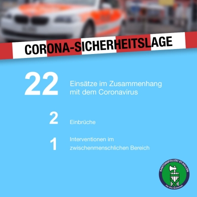 In der Zeit zwischen Donnerstag und Freitagmorgen (17.04.2020) ist die Kantonspolizei St.Gallen 22 Mal im Zusammenhang mit dem Coronavirus ausgerückt. Im zwischenmenschlichen Bereich musste lediglich ein Mal interveniert werden. Hinzu kam zwei Meldungen von Einbruchdiebstählen in Waschanlagen.