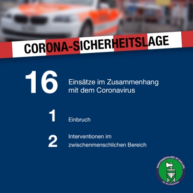 In der Zeit zwischen Dienstagmorgen und Mittwochmorgen (22.04.2020) ist die Kantonspolizei St.Gallen 16 Mal im Zusammenhang mit dem Coronavirus ausgerückt. In derselben Zeit wurde ein Einbruch gemeldet und es kam zu zwei Interventionen im zwischenmenschlichen Bereich.
