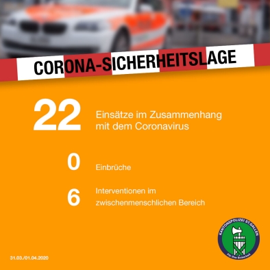 In der Zeit zwischen Dienstag- und Mittwochmorgen (01.04.2020) ist die Kantonspolizei St.Gallen mit 22 Einsätzen bezüglich der aktuellen Coronavirus-Problematik beschäftigt gewesen.