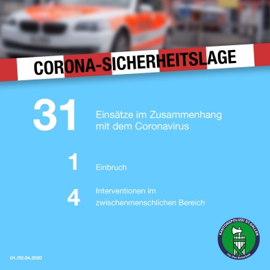 In der Zeit zwischen Mittwoch- und Donnerstagmorgen (02.04.2020) ist die Kantonspolizei St.Gallen mit insgesamt 31 Fällen im Zusammenhang mit der Corona-Problematik beschäftigt gewesen.