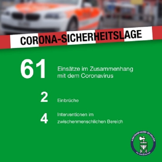 In der Zeit zwischen Sonntagmorgen und Ostermontagmorgen (13.04.2020) ist die Kantonspolizei St.Gallen 61 Mal im Zusammenhang mit dem Coronavirus ausgerückt. Im zwischenmenschlichen Bereich musste lediglich vier Mal interveniert werden. Bei einem Einbruchdiebstahl in eine Kindertagesstätte wurde Bargeld in unbekannter Höhe gestohlen. Zigaretten im Wert von mehreren tausend Franken wurden bei einem Einbruch in einen Tankstellenshop gestohlen.