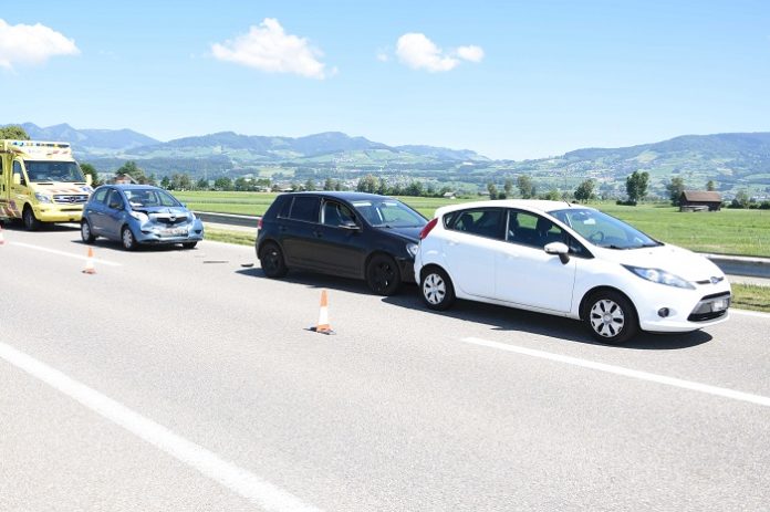 Ein 52-jähriger Mann fuhr von Hinwil in Richtung Reichenburg. Aufgrund momentaner Unaufmerksamkeit bemerkte er das vor ihm bremsende Auto zu spät. Trotz Vollbremsung prallte sein Auto daraufhin in das Auto eines 25-Jährigen. Dessen Auto wurde durch die Wucht des Aufpralls in das Auto einer vorausfahrenden 30-jährigen Frau geschoben. Bei den Kollisionen wurden der 52-Jährige und seine Mitfahrerin sowie der 25-Jährige und dessen Mitfahrerin leicht verletzt.