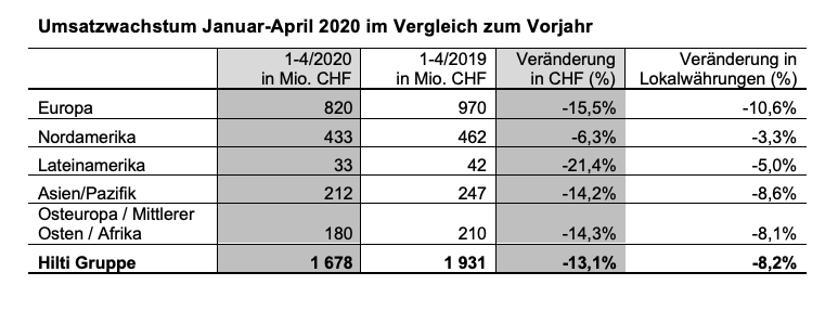 Infolge der wirtschaftlichen Auswirkungen der COVID-19-Pandemie verzeichnete die Hilti Gruppe nach den ersten vier Monaten 2020 eine deutliche Abschwächung des Geschäfts. Der Gesamtumsatz sank im Vorjahresvergleich um 13,1 Prozent auf CHF 1678 Mio. In Lokalwährungen lag der Rückgang bei 8,2 Prozent.