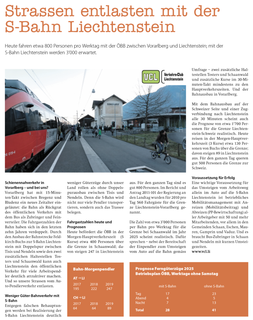 Georg Sele: Der VCL befasst sich seit 1995 mit strassenunabhängigem öffentlichem Verkehr. Dies in der Erkenntnis, dass nur ein vom Autostau unabhängiger ÖV mit mindestens 30-Minuten-Takt ein wesentliches Umsteigen bewirkt. Dank VCL-Initiative haben wir heute auf der ÖBB-Strecke Buchs-Feldkirch einen Mittelverteiler – leider mit nur wenigen für Zupendler relevanten Kursen. Der Ausbau zur S-Bahn Liechtenstein im 30-Minuten-Takt ist ein wesentlicher Attraktivitäts-Sprung, vor allem für viele Arbeitskräfte aus der Region. So werden unsere Strassen entlastet und wir bleiben ein attraktiver Wirtschaftsraum mit hoher Lebensqualität.