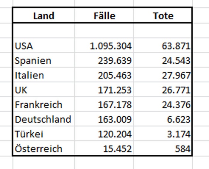 Trauriger Spitzenreiter sind dabei weiterhin die USA. Hier wurden inzwischen schon mehr als eine Million Fälle registriert, 63.000 Personen sind an Covid-19 gestorben. Dahinter folgen Spanien, Italien, Frankreich, Deutschland und Großbritannien. Am meisten Todesopfer in Europa melden Italien und Großbritannien.