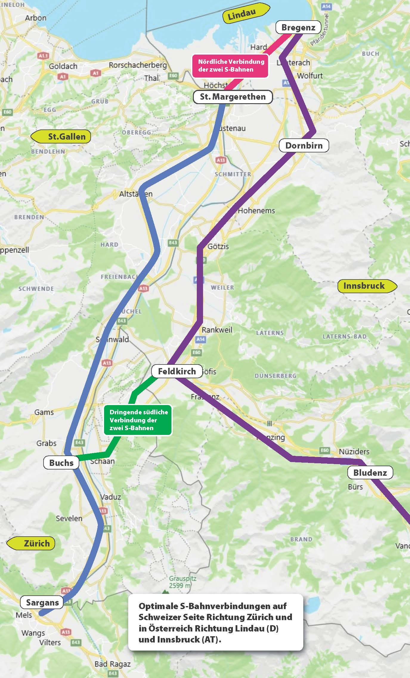 - Im Norden sind die zwei S-Bahnen zwischen St. Margrethen und Bregenz verbunden.