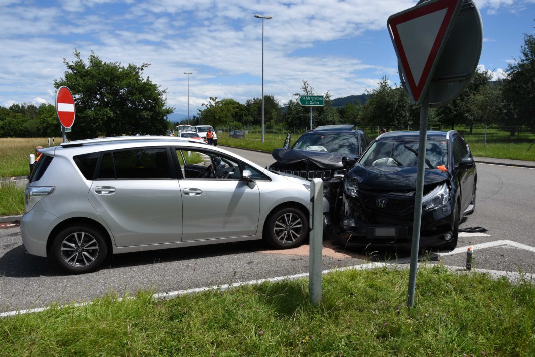 Eine 48-jährige Frau fuhr mit ihrem Auto auf der Büelstrasse und beabsichtigte bei der Einspurstrecke die Autobahn A23 in Richtung St.Margrethen zu befahren. Beim Abbiegen übersah sie das korrekt entgegenkommende Auto einer 31-jährigen Frau, in welchem sich zudem eine 34-jährige Mitfahrerin und ein einjähriges Kleinkind befanden. Folglich kam es zur Kollision zwischen den beiden Fahrzeugen. Durch die Wucht des Zusammenstosses wurden die beiden Autos abgewiesen und prallten in ein weiteres Auto, welches in der Autobahnausfahrt stand. Die 34-jährige Beifahrerin und das einjährige Kleinkind wurden leicht verletzt und zur Kontrolle mit der Rettung ins Spital gefahren. Alle drei Autos wurden stark beschädigt. Es entstand Sachschaden von mehreren zehntausend Franken.