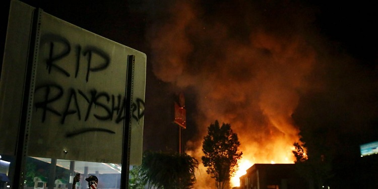 Der Tod des 27-jährigen Afro-Amerikaners löste in Atlanta gewaltsame Proteste aus. Das Restaurant, vor dem der junge Mann gewartet hatte, als die Polizei ihn festnehmen wollte, stand am Samstag in Flammen. Foto: AP