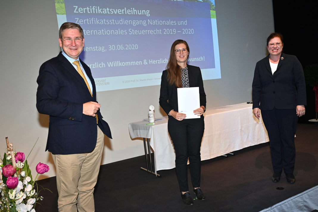 Professor Dr. Martin Wenz, Inhaber des Lehrstuhls für Betriebswirtschaftliche Steuerlehre, Internationales und Liechtensteinisches Steuerrecht, hiess am vergangenen Dienstag, 30.6., die Absolventinnen und Absolventen und ihre ausgewählten Begleitpersonen zu ihrer Abschlussfeier herzlich willkommen. Nach einer Festrede von Dr. iur. Johanna Niegel, LL.M., TEP, übernahm Professor Wenz im Anschluss die Übergabe der Zertifikate vor und gratulierte ihnen unter Einhaltung der Abstandsregeln zum erfolgreichen Abschluss.