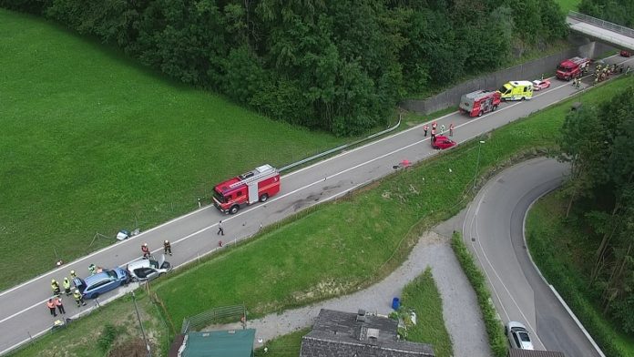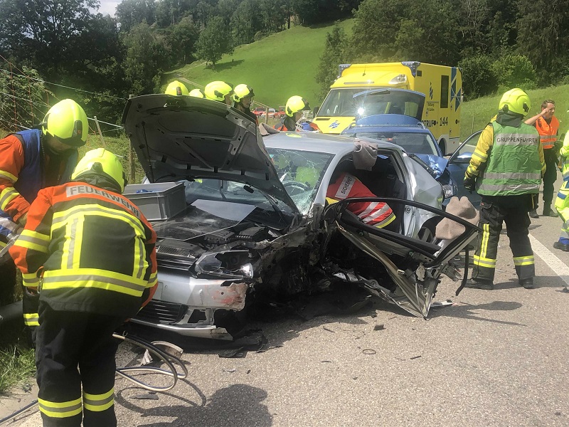 (Ebnat-Kappel) – Am Sonntagnachmittag (26.07.2020), kurz nach 14 Uhr, ist es auf der Umfahrungsstrasse zu einer schweren Frontalkollision von drei Personenwagen gekommen. Es wurden sieben Personen teilweise schwer verletzt. Es erfolgte ein Grossaufgebot aller Blaulichtorganisationen.