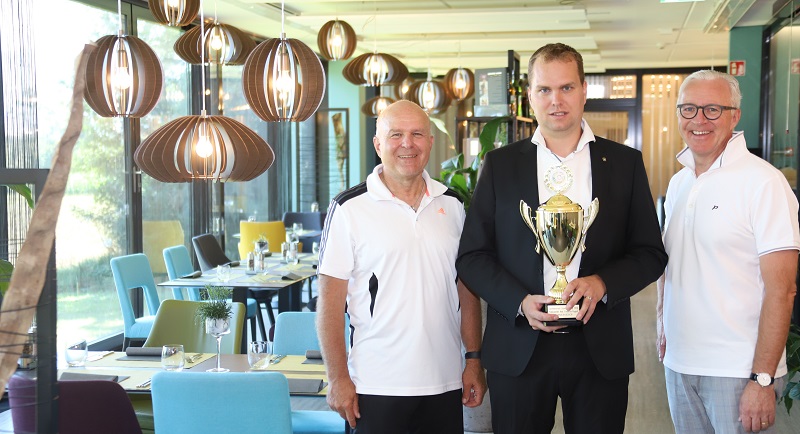 Legende: Der Siegerpokal steht schon im Frederick in Ruggell: Die Organisatoren Andreas Kollmann (links) und Georges Lüchinger (rechts) mit Frederick-Gastgeber Mario Walch sind gespannt, wer den Pokal in diesem Jahr in die Höhe stemmen wird.