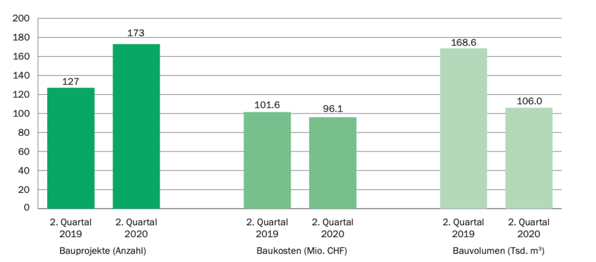 Private Auftraggeber planten im 2. Quartal 2020 mit Baukosten von CHF 88.2 Mio., nach CHF 93.5 Mio. im Vorjahresquartal. Die erteilten Baubewilligungen an öffentliche Auftraggeber umfassten Bauprojekte mit geplanten Baukosten von CHF 7.9 Mio., nach CHF 8.1 Mio. im Vorjahresquartal.