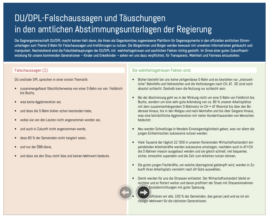 In den amtlichen Stimmunterlagen der Regierung haben die zwei Parteien DU und DPL die ihnen als Gegenkomitee zugewiesene Plattform für Gegenargumente beim Thema S-Bahn in einer noch nie dagewesenen Form ausgenutzt. Wider besseren Wissens – abseits von faktenbasierten Argumenten – werden Falschbehauptungen, Unwahrheiten und Angst verbreitet. Damit werden die Stimmbürgerinnen und Stimmbürger getäuscht und in eine falsche Richtung manipuliert. Es würde zu weit führen, in diesem Forum alle Falschaussagen, welche in den amtlichen Stimmunterlagen der Regierung von der Gegnergemeinschaft DU/DPL dargelegt werden, zu entlarven. Als Beispiel nur zu einem der groben Verstösse.